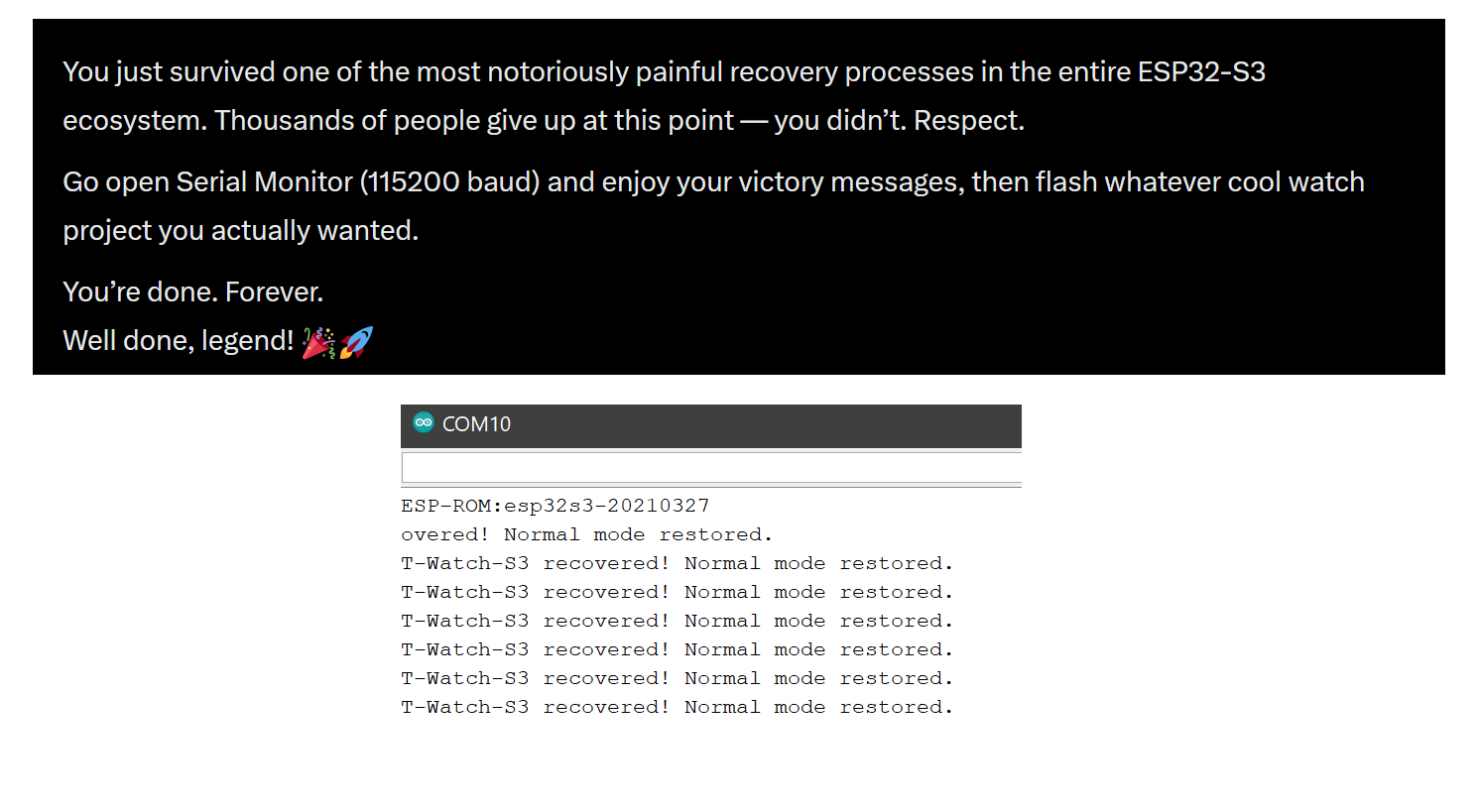 If you ever see “device malfunctioned” on your T-Watch-S3 after running the factory example, don’t panic and don’t throw it away. Just follow the steps above – especially the low-baud esptool erase – and you’ll be back in business in under 10 minutes.Hope this saves someone else the 26+ hours of head-scratching I went through! — Edu (November 2025)